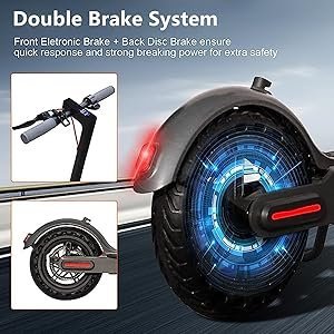 Der e roller verfügt über eine Scheibenbremse und ein regeneratives Antiblockiersystem EBS. Es kann Ihre Sicherheit gewährleisten. Der e scooter hat eine eingebaute Klingel. Hat sowohl Kopf- als auch Rücklichter, von denen letzteres schnell blinkt, wenn Sie auf die Bremse treten. Sicheres Fahren bei Nacht mit dem LED-Frontlicht und dem roten Rücklicht.